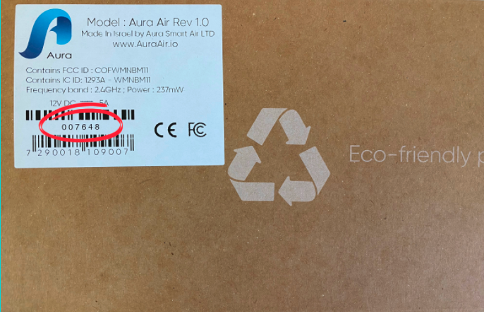 You can locate the Serial Number of your Aura Air device on the sticker that’s either on your package or on the rear side of the device.