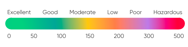 The AQI scale goes from 0 = 'Excellent' to 500 = 'Hazardous' with 6 color-coded categories of equal lengths. AQI’s often vary between countries.