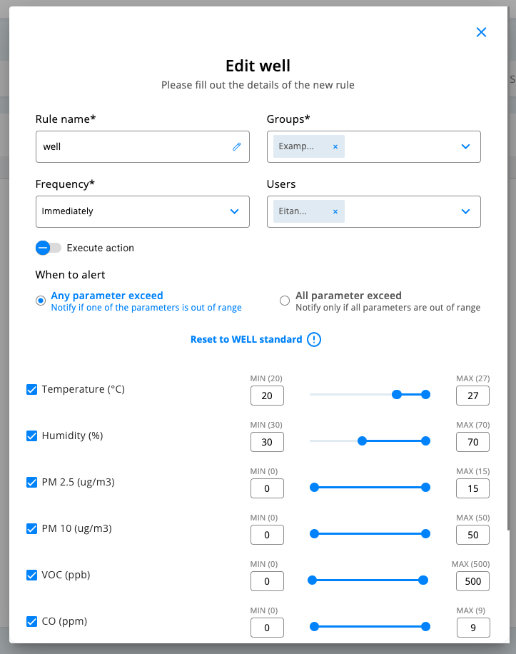 Default rule settings are based on the WELL Building Standard, developed by the International WELL Building Institute (IWBI). WELL is a performance-based system for measuring, certifying, and monitoring building features that impact human health and wellbeing. It focuses on seven core concepts: Air, Water, Nourishment, Light, Fitness, Comfort, and Mind. The standard is backed by medical and scientific research and provides evidence-based guidelines for creating healthier indoor spaces that support human health.