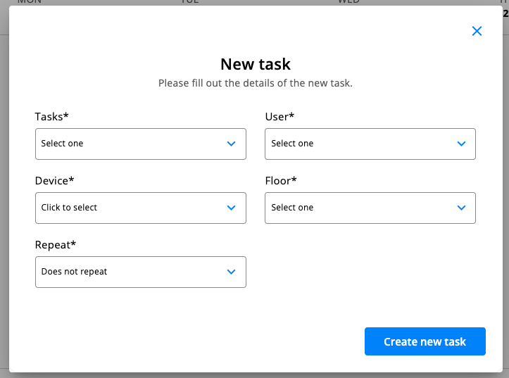 The Tasks page displays all your air quality-related tasks in a weekly or monthly calendar format. This central hub helps you organize maintenance schedules, track assignments, and coordinate your team's work across all devices.
