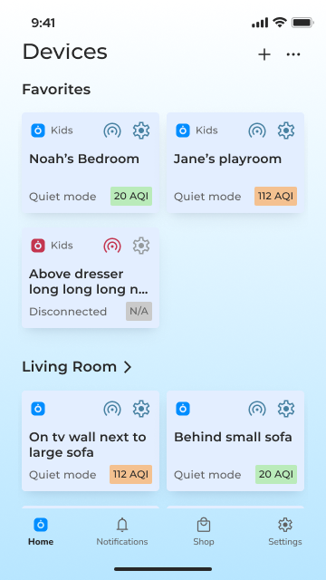 - The bottom navigation shows: Home, Notifications, Shop, and Settings