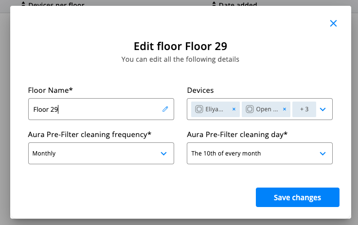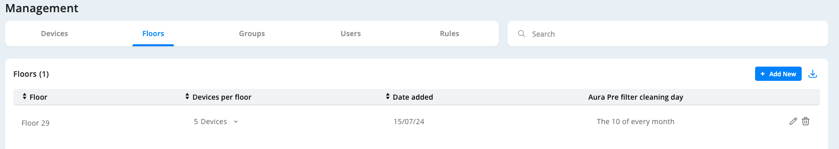 סקירה כללית לשונית הקומות בקטע הניהול מאפשרת לכם לארגן את המכשירים שלכם לפי קומה או מיקום, מה שמקל על ניהול התקנות גדולות על פני רמות או אזורים מרובים. התצוגה המרכזית הזאת עוזרת לכם לעקוב אחר התפלגות המכשירים, לתזמן תחזוקה ולתאם פעילויות ניקוי לפי קומה.